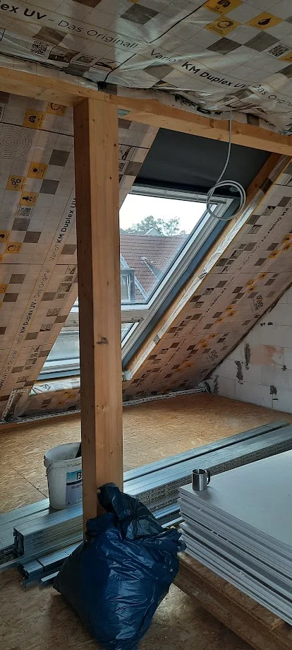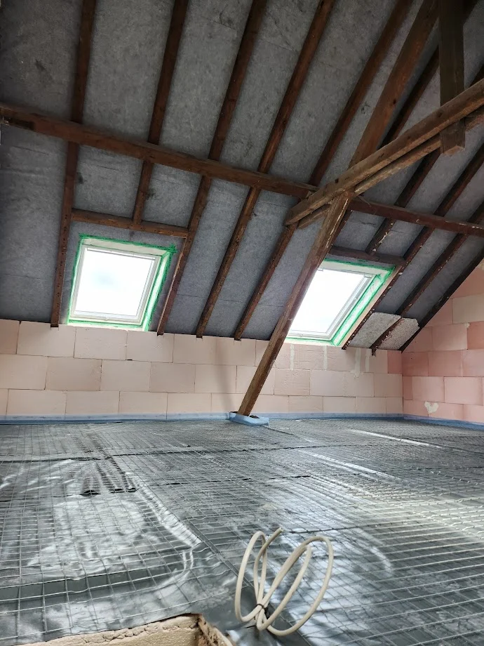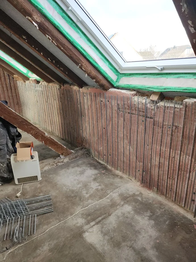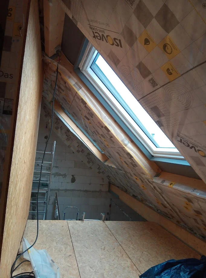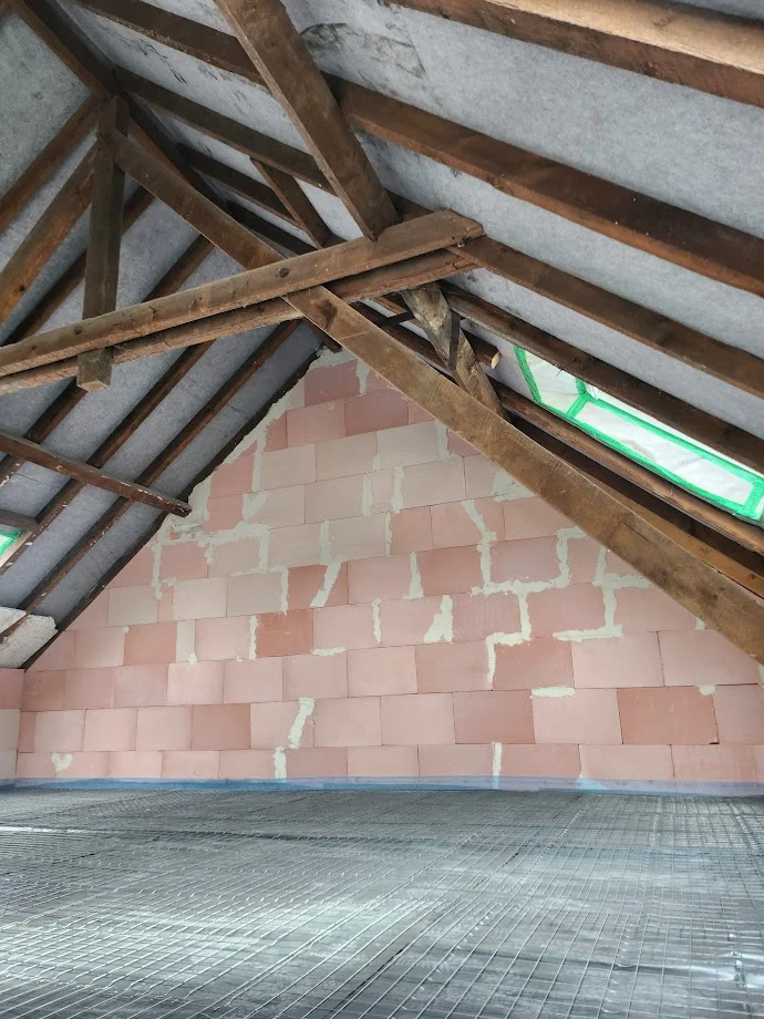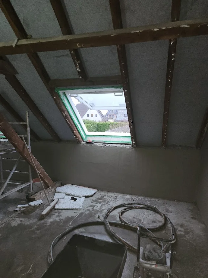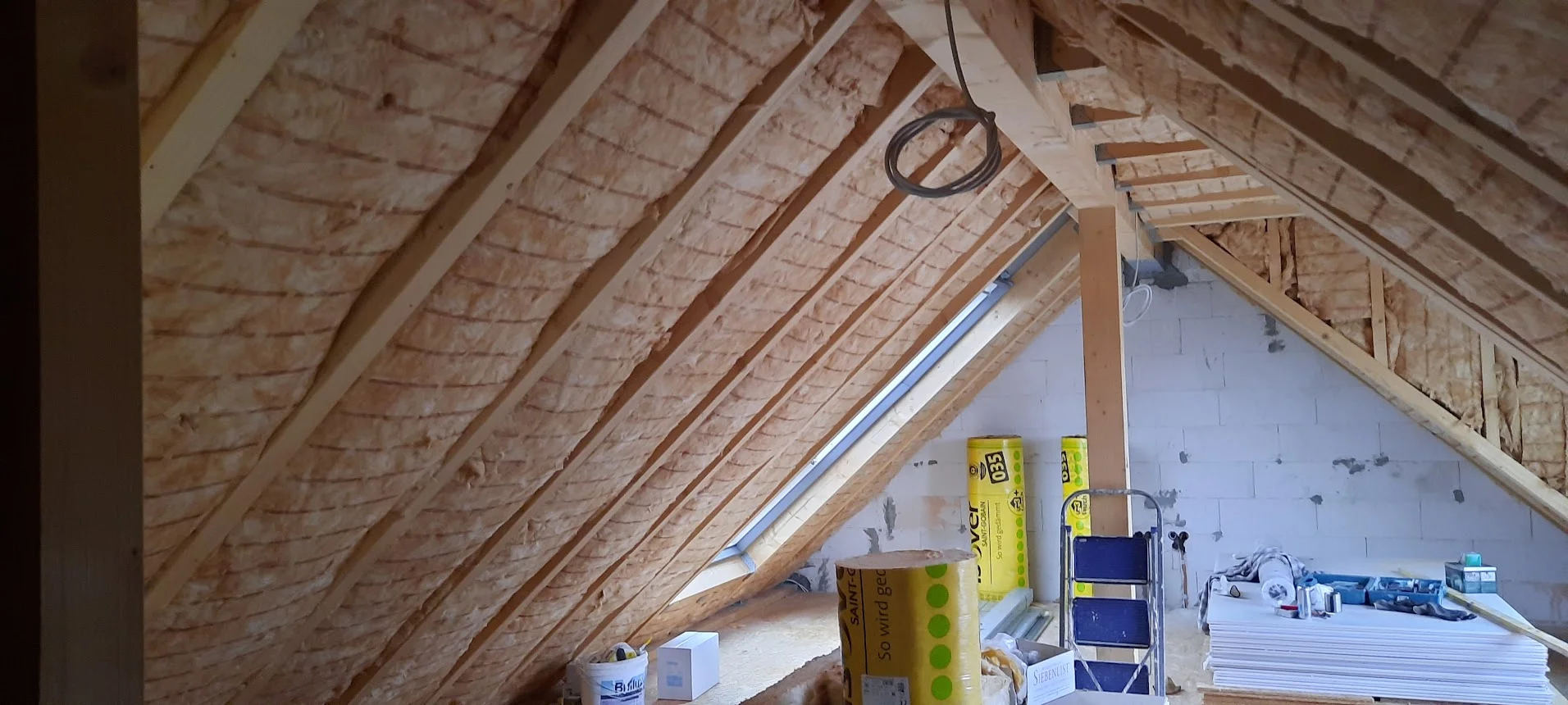 Die geneigten Dach- und Deckenflächen wurden fachgerecht mit mineralischer Wärmedämmung ausgeführt. Die Dämmung wurde passgenau und hohlraumfrei eingebaut. Auf der warmen Seite der Konstruktion erfolgte die Herstellung der Luftdichtheit mittels Dampfbremse, einschließlich luftdichter Verklebung aller Stöße, Anschlüsse und Durchdringungen.