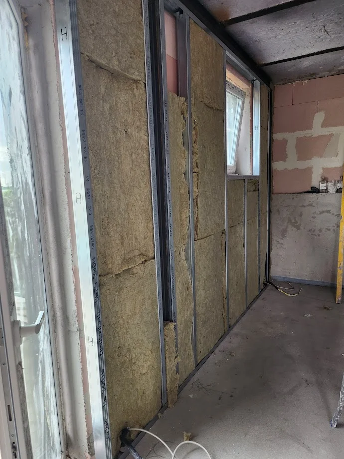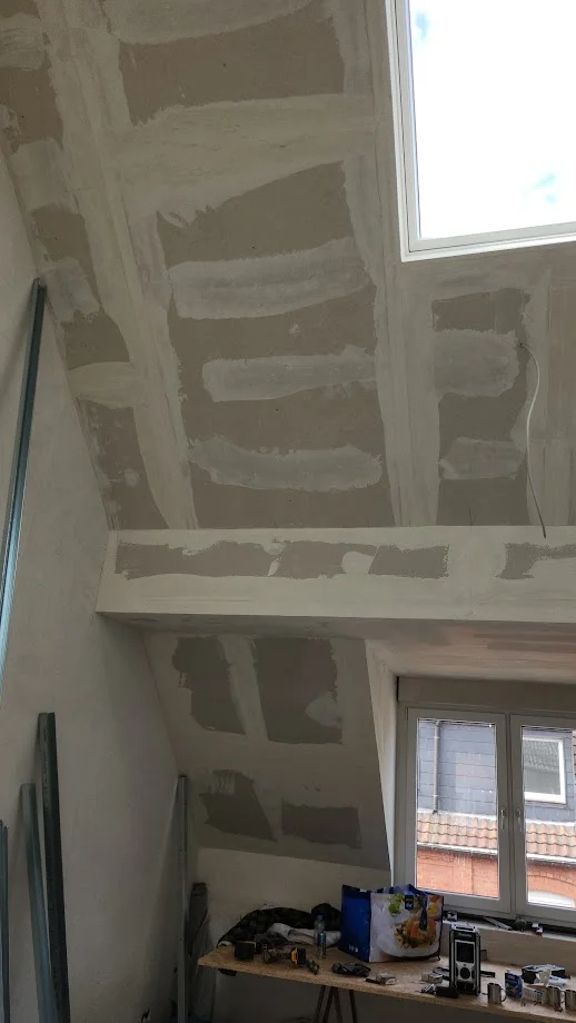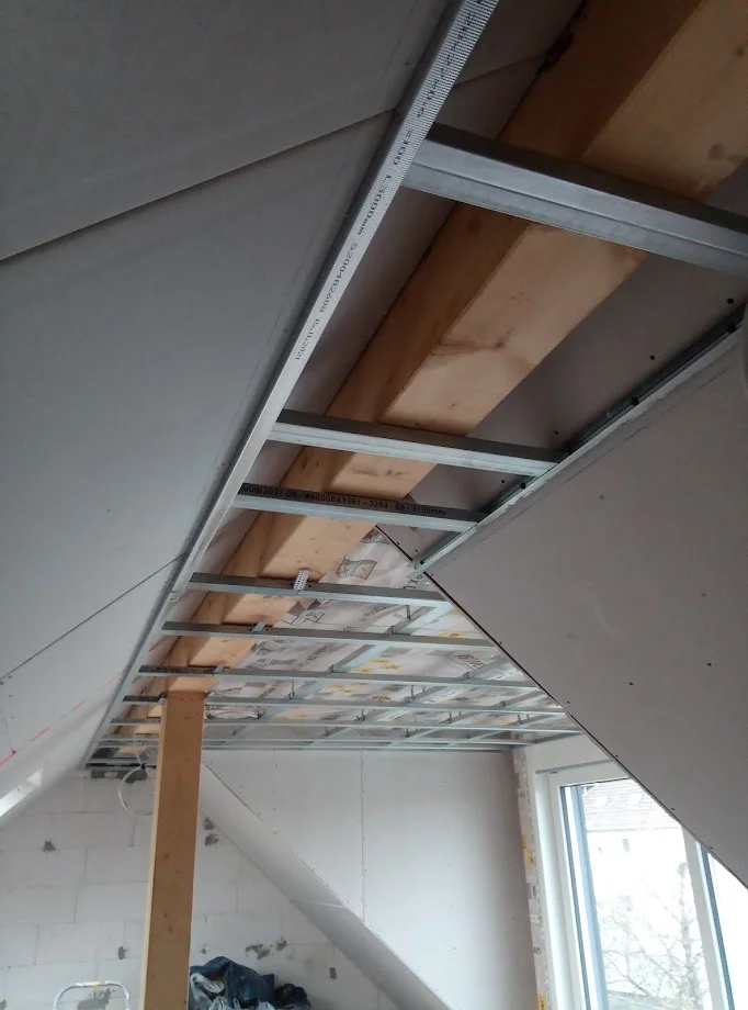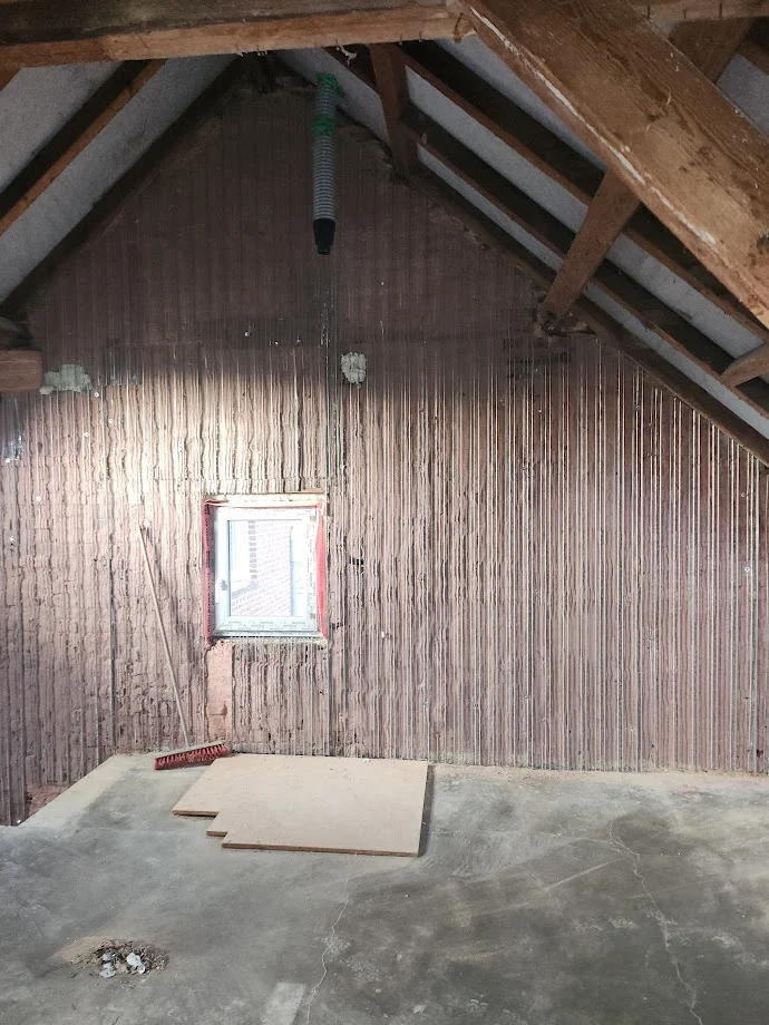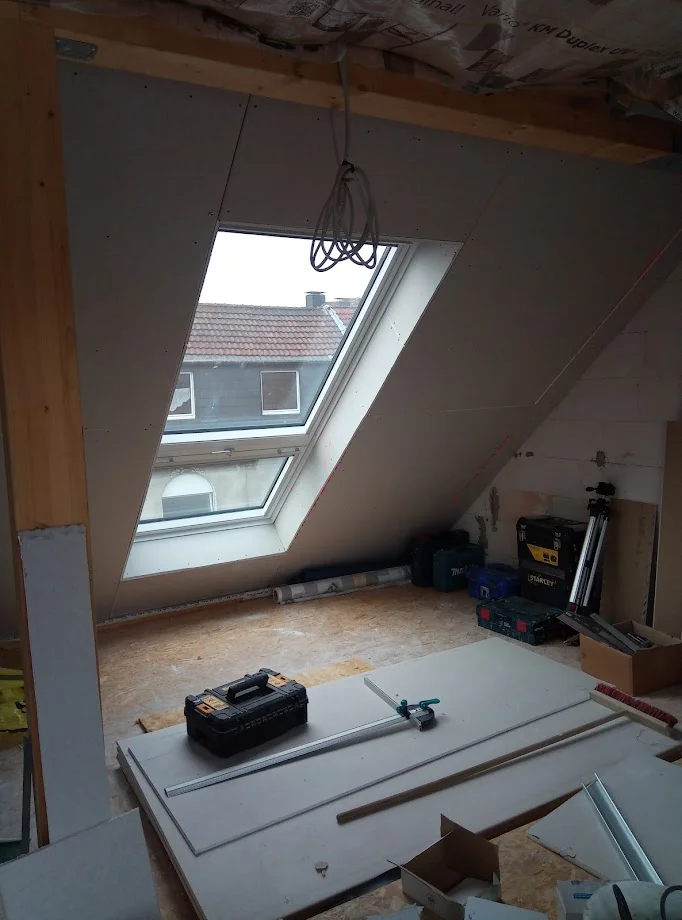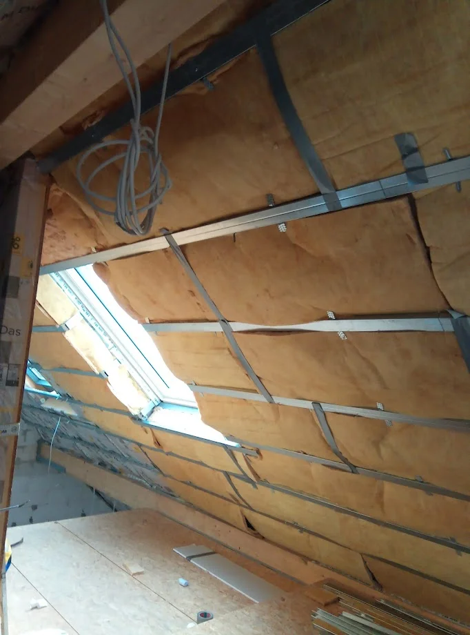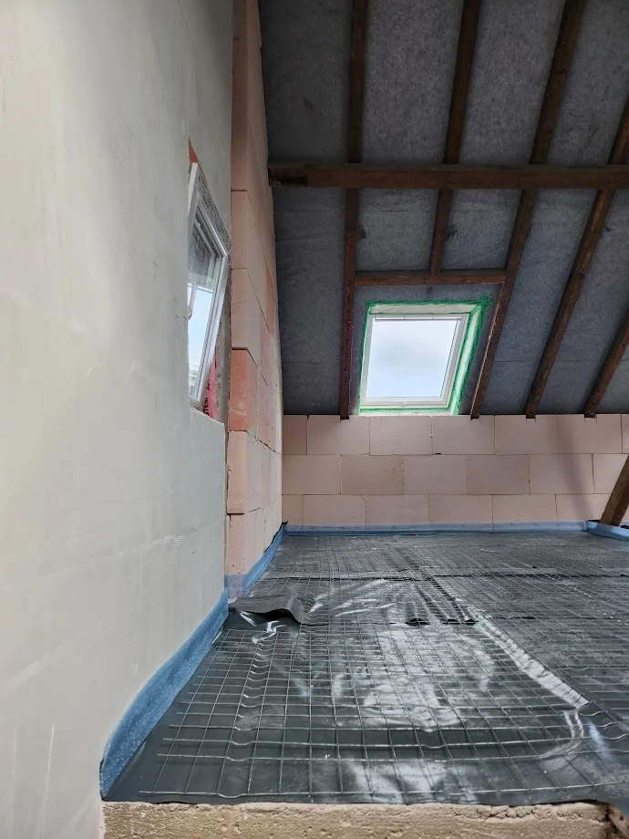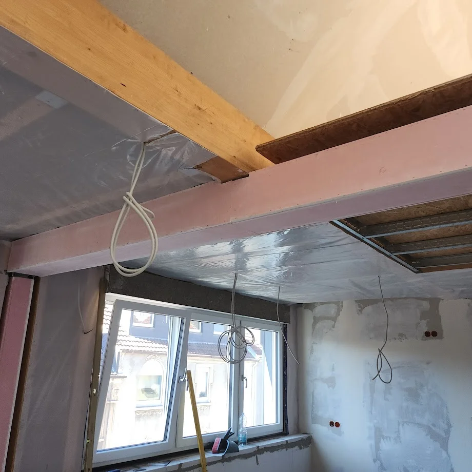 Die geneigten Dach- und Deckenflächen wurden fachgerecht mit mineralischer Wärmedämmung ausgeführt. Die Dämmung wurde passgenau und hohlraumfrei eingebaut. Auf der warmen Seite der Konstruktion erfolgte die Herstellung der Luftdichtheit mittels Dampfbremse, einschließlich luftdichter Verklebung aller Stöße, Anschlüsse und Durchdringungen.