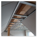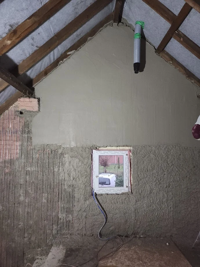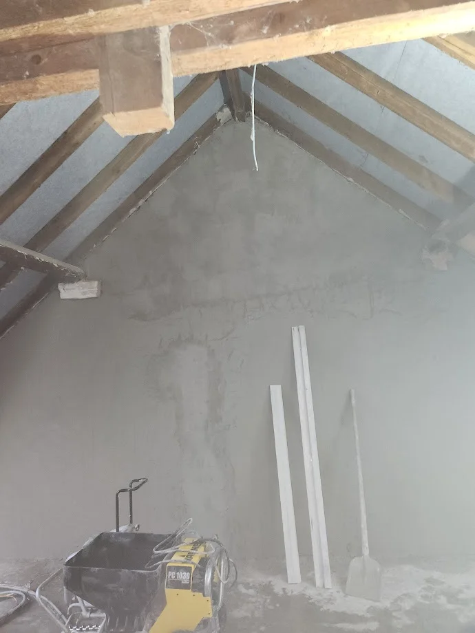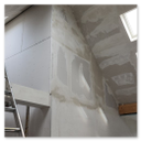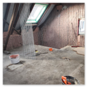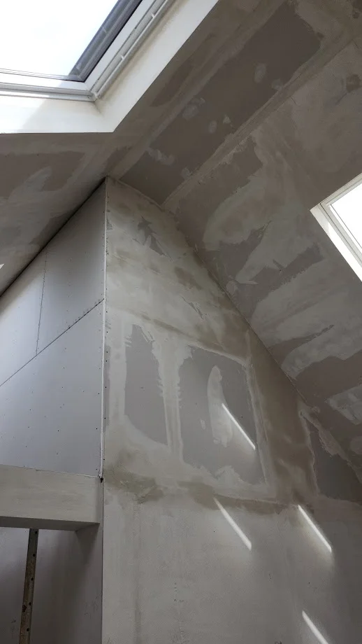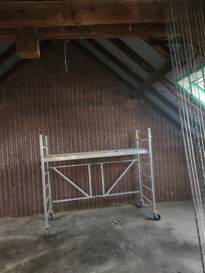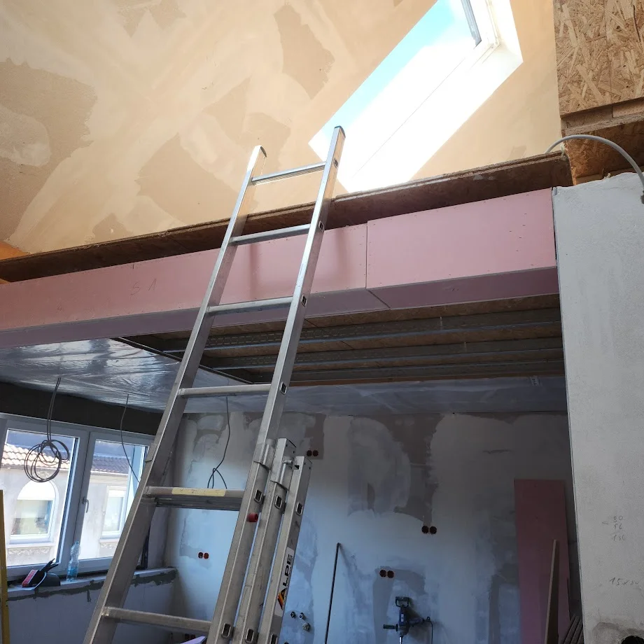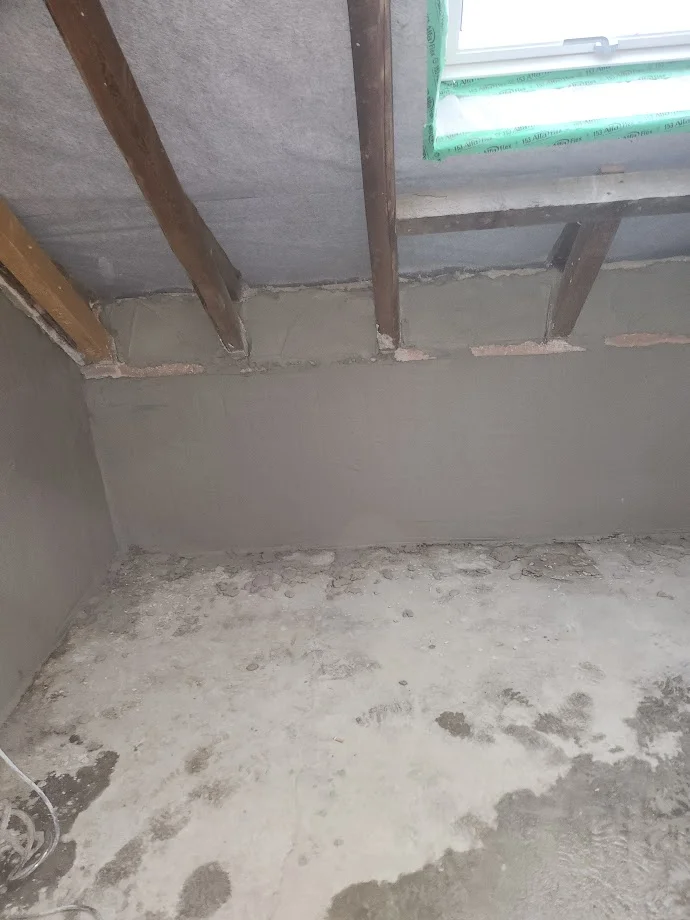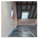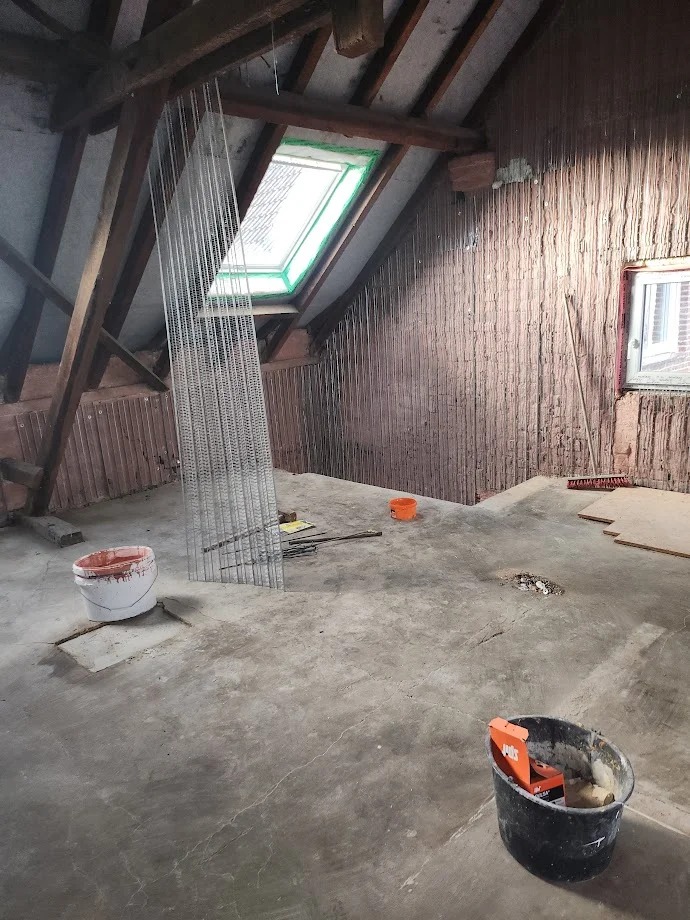 Die geneigten Dach- und Deckenflächen wurden fachgerecht mit mineralischer Wärmedämmung ausgeführt. Die Dämmung wurde passgenau und hohlraumfrei eingebaut. Auf der warmen Seite der Konstruktion erfolgte die Herstellung der Luftdichtheit mittels Dampfbremse, einschließlich luftdichter Verklebung aller Stöße, Anschlüsse und Durchdringungen.