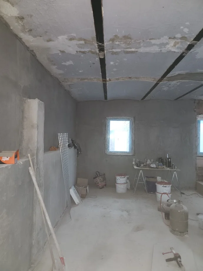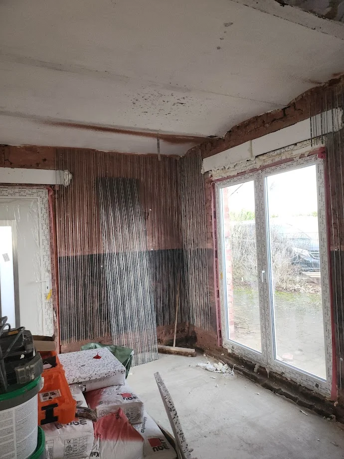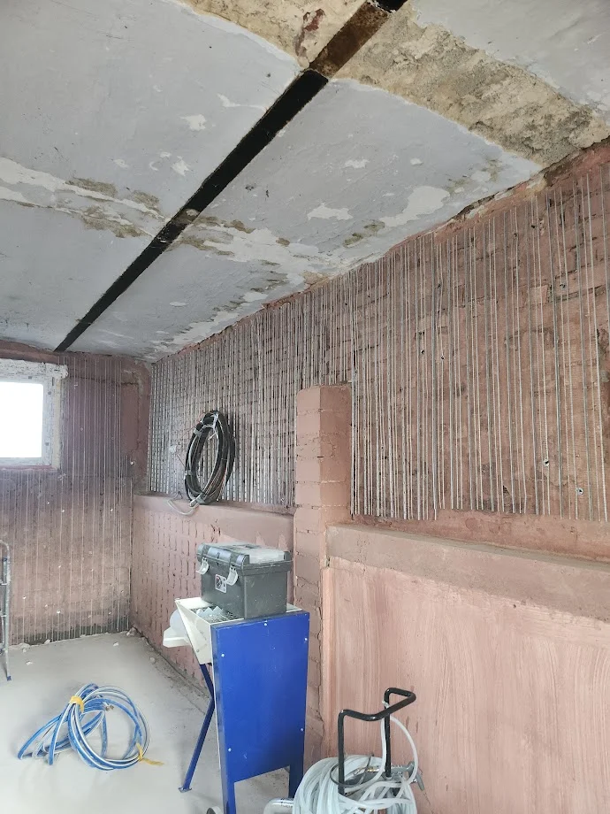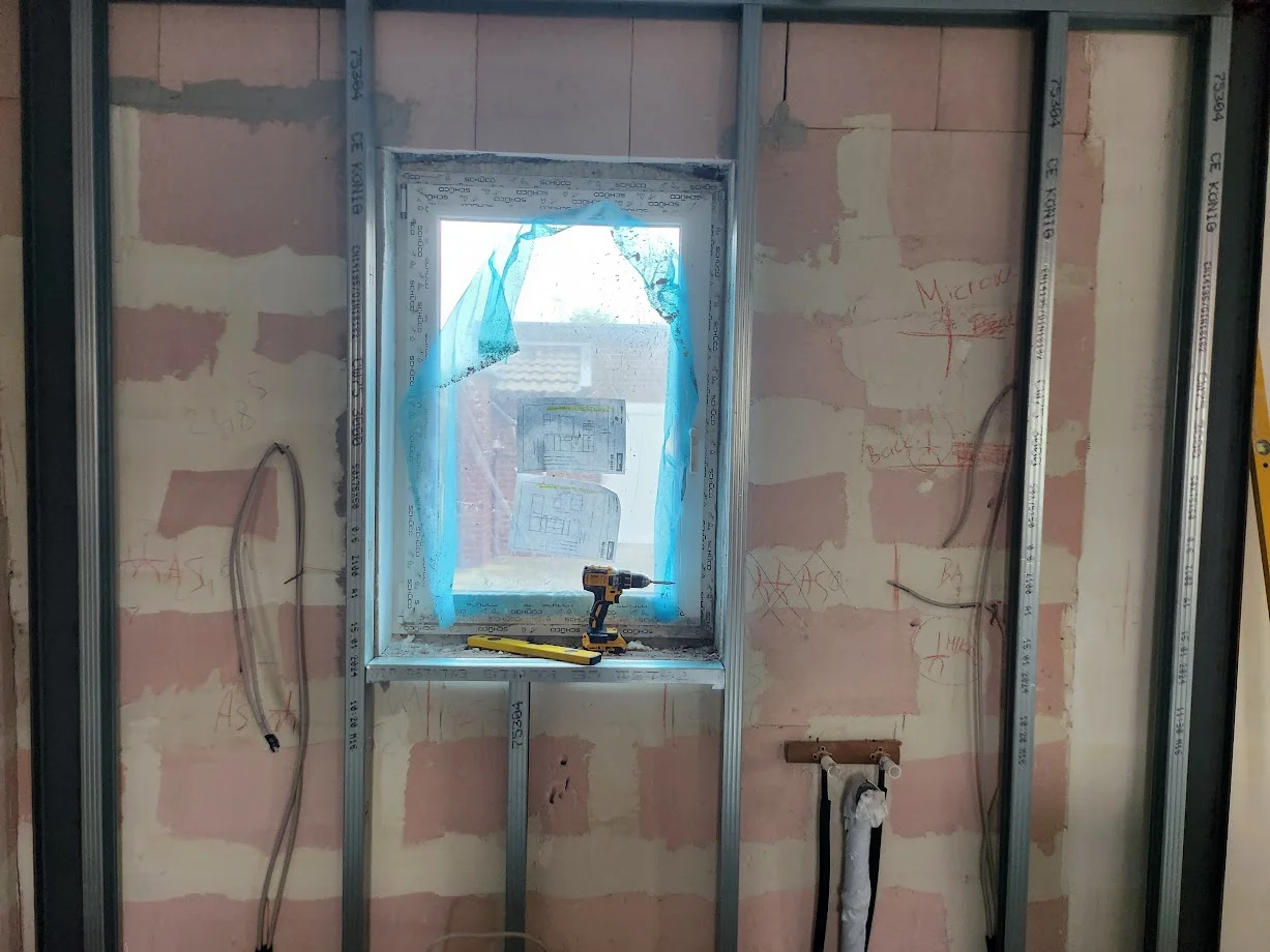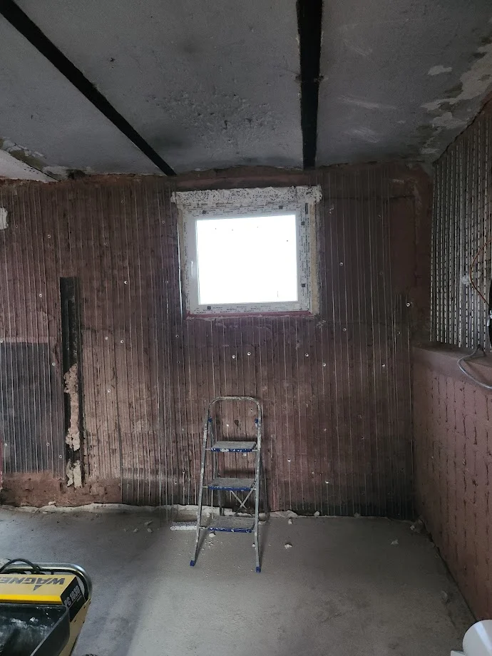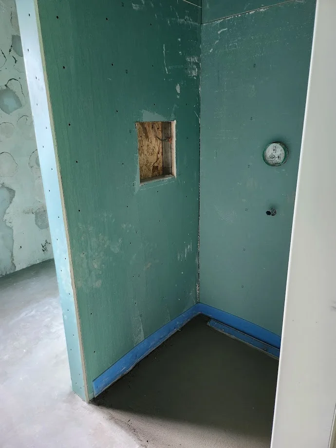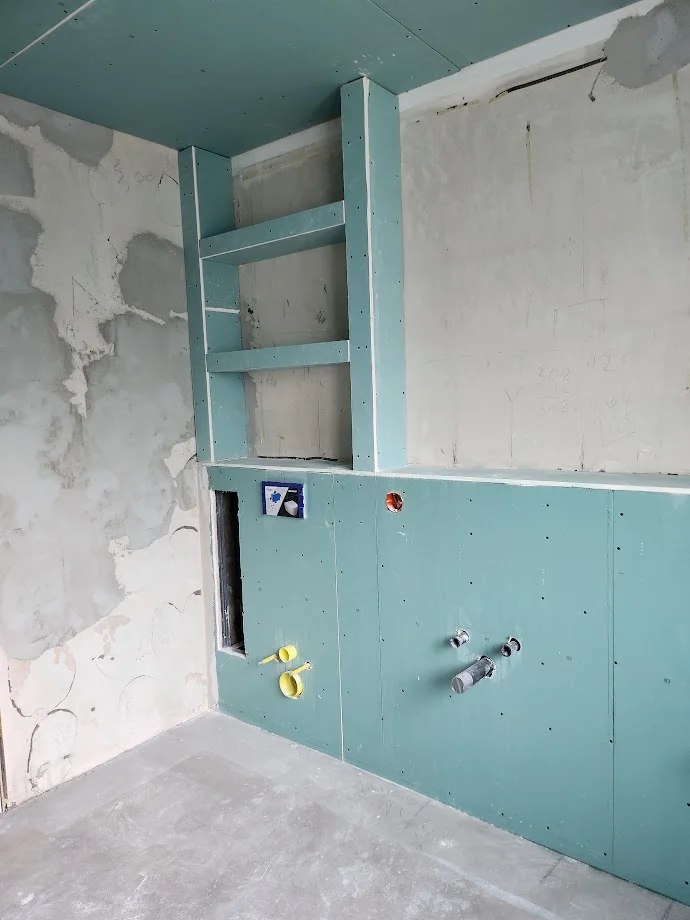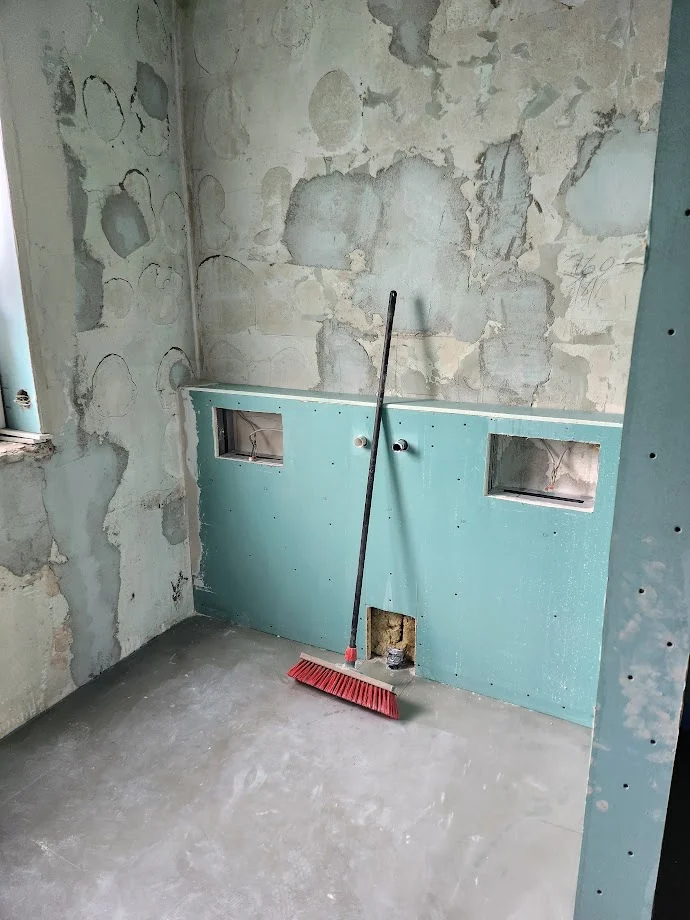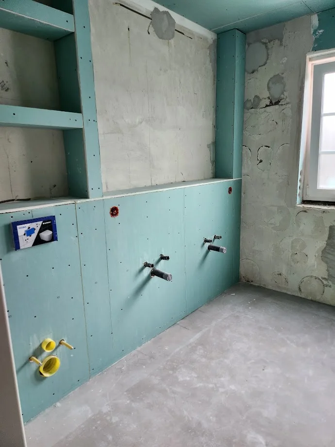 Die Wände wurden begradigt, teilweise neu beplankt und anschließend für die Fliesenarbeiten vorbereitet.