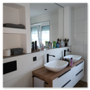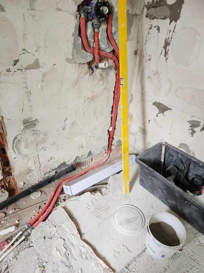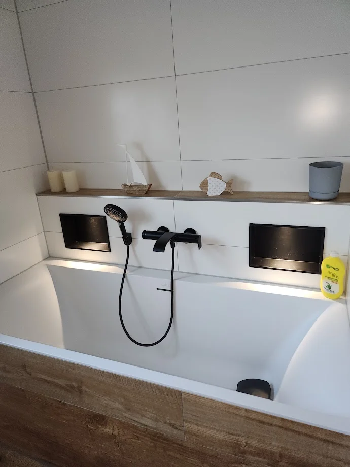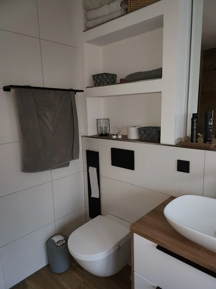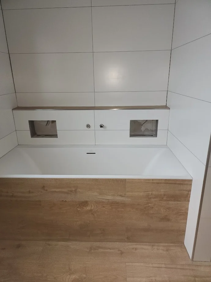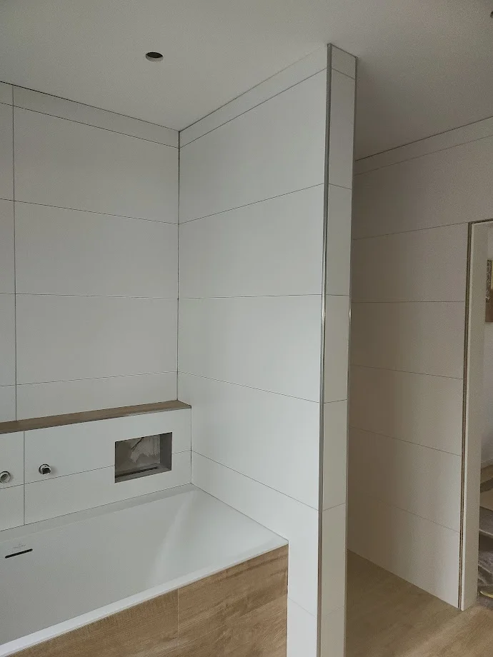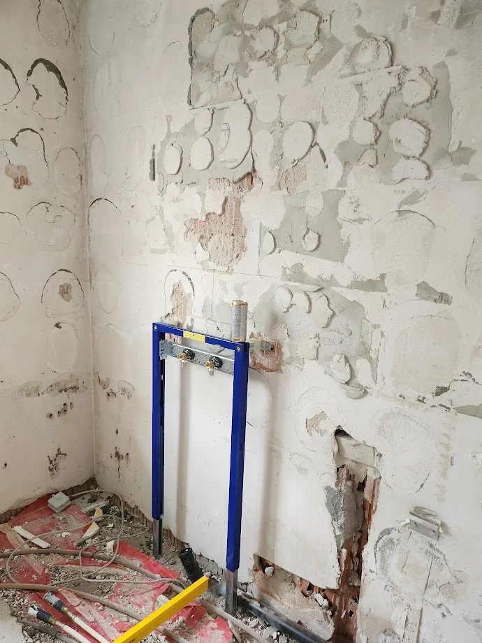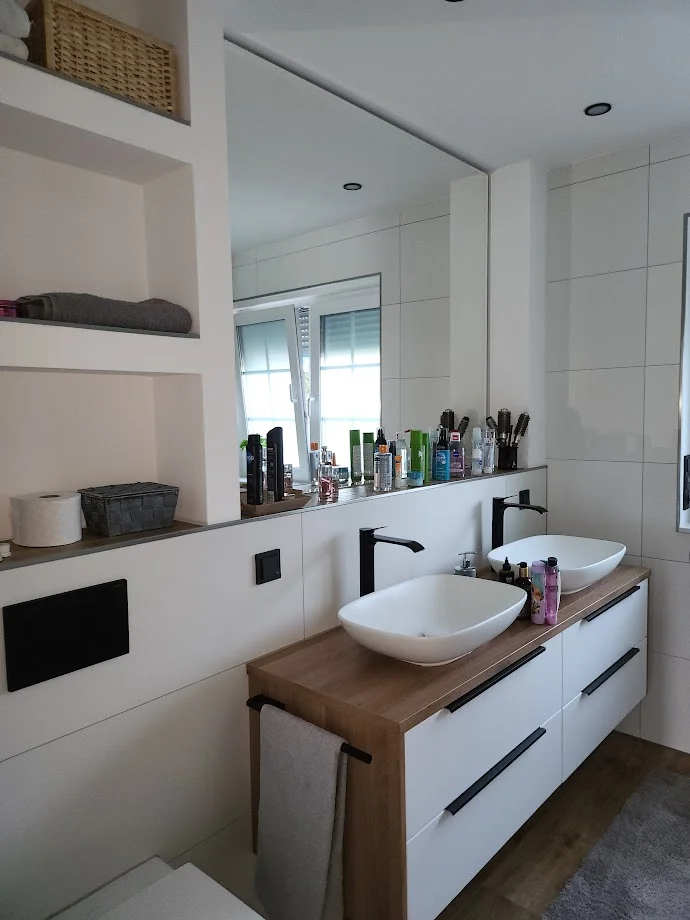 Im Rahmen der Badsanierung wurde das Badezimmer vollständig entkernt und technisch wie optisch neu aufgebaut. Sämtliche alten Installationen, Wand- und Bodenbeläge wurden fachgerecht entfernt und die Leitungsführung komplett erneuert.