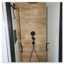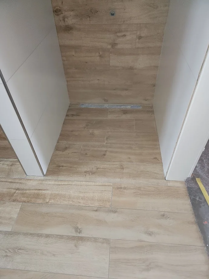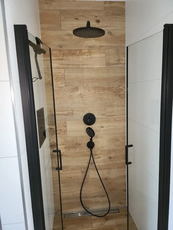 Im Duschbereich kam eine bodengleiche Dusche mit moderner Ablauftechnik zum Einsatz. Hochwertige Fliesen in Kombination mit Holzoptik-Akzenten schaffen ein modernes, warmes und zeitloses Erscheinungsbild.